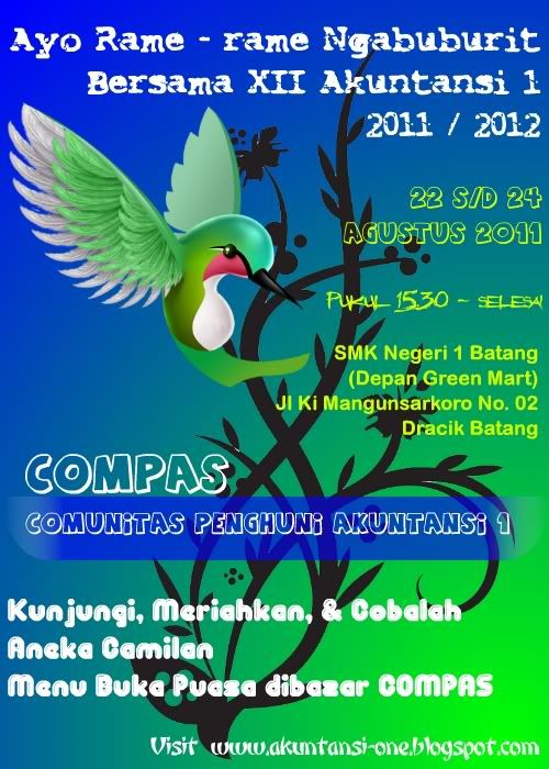 Kunjungi dan Belilah Aneka Camilan Ramadhan Kelas XII Akuntansi 1 SMK Negeri 1 Batang Tahun 2011/2012 tanggal 22 s/d 24 Agustus 2011 di Halaman Green Mart SMK Negeri 1 Batang, Jl Ki Mangunsarkoro No. 02 Dracik Batang